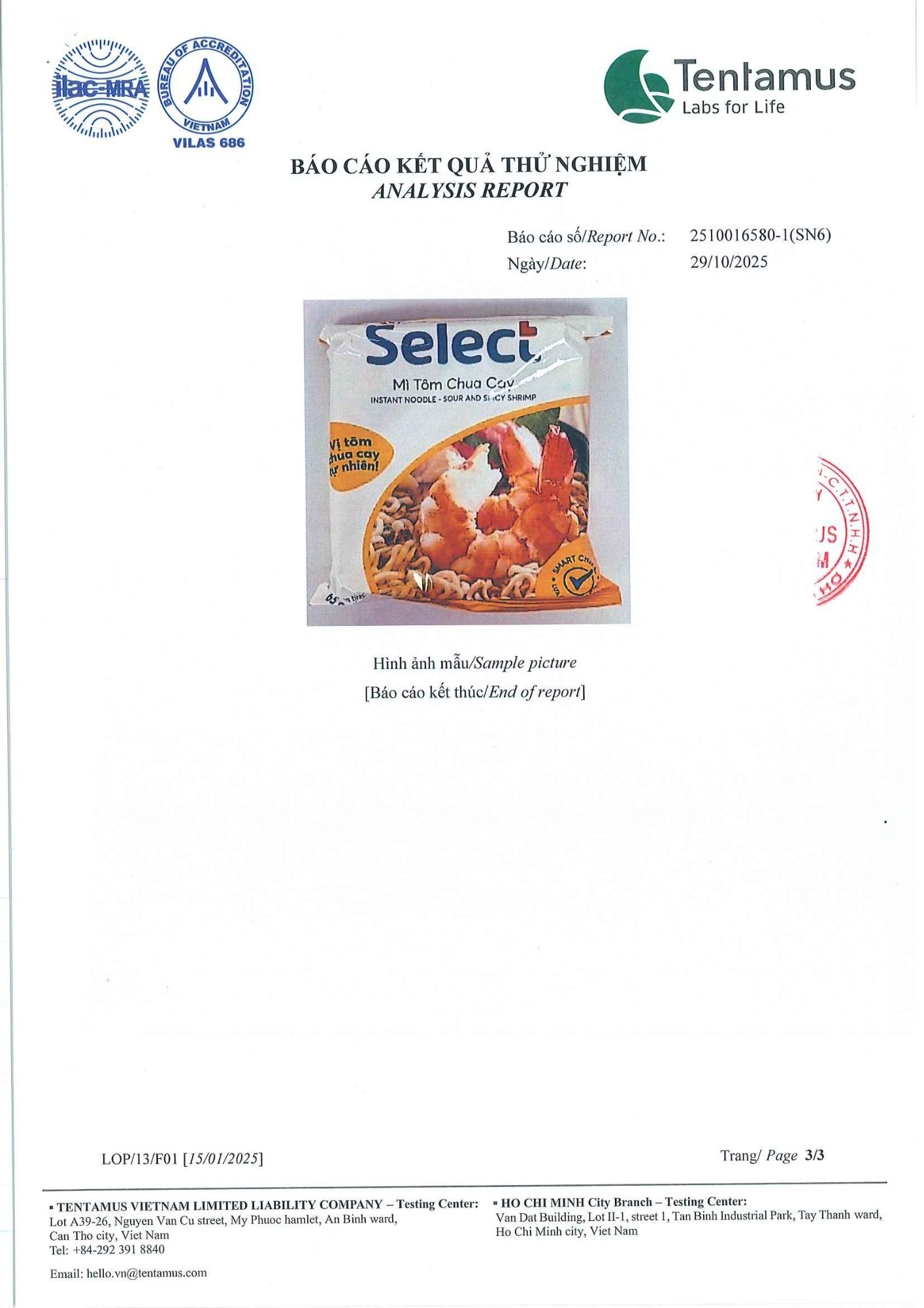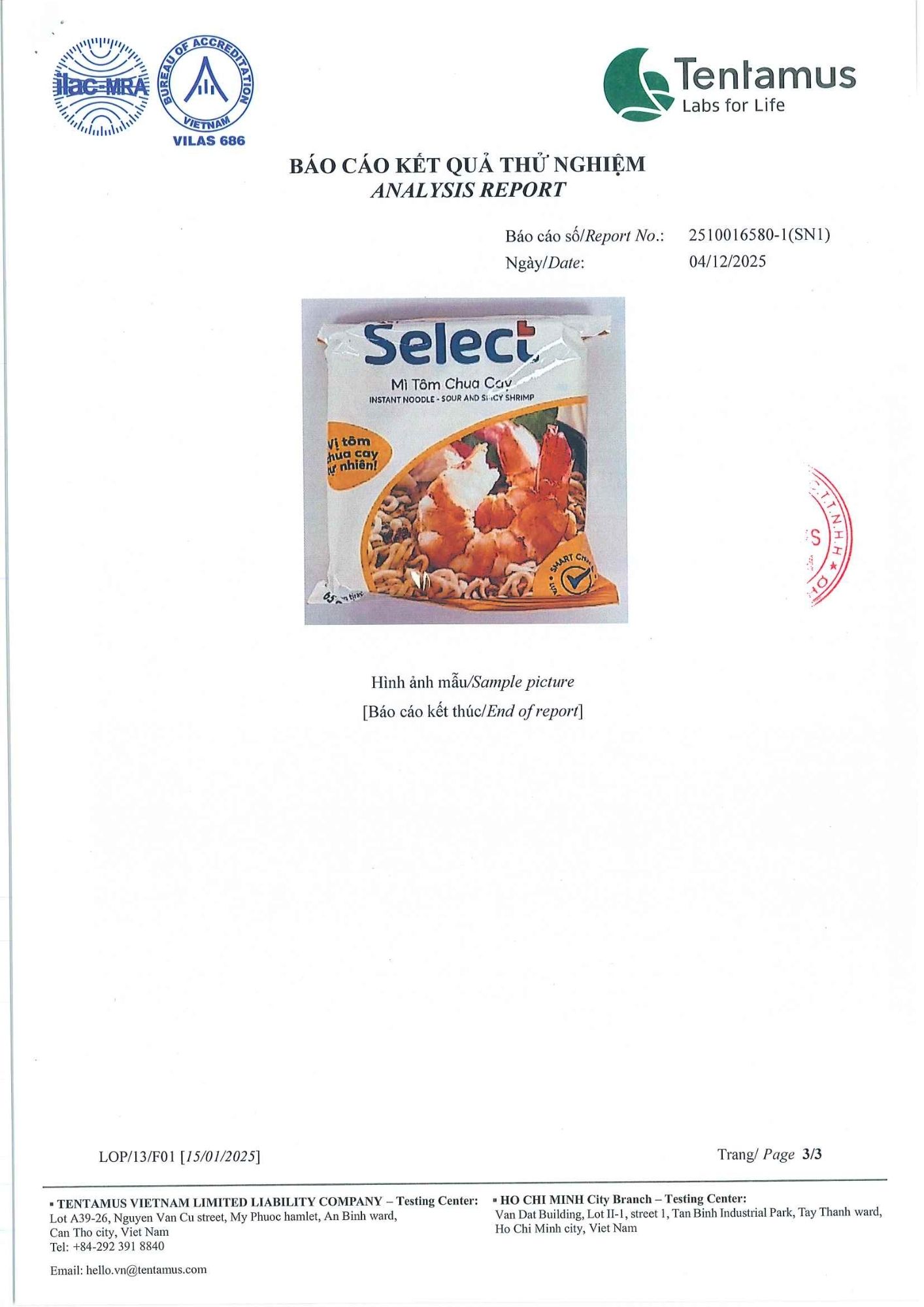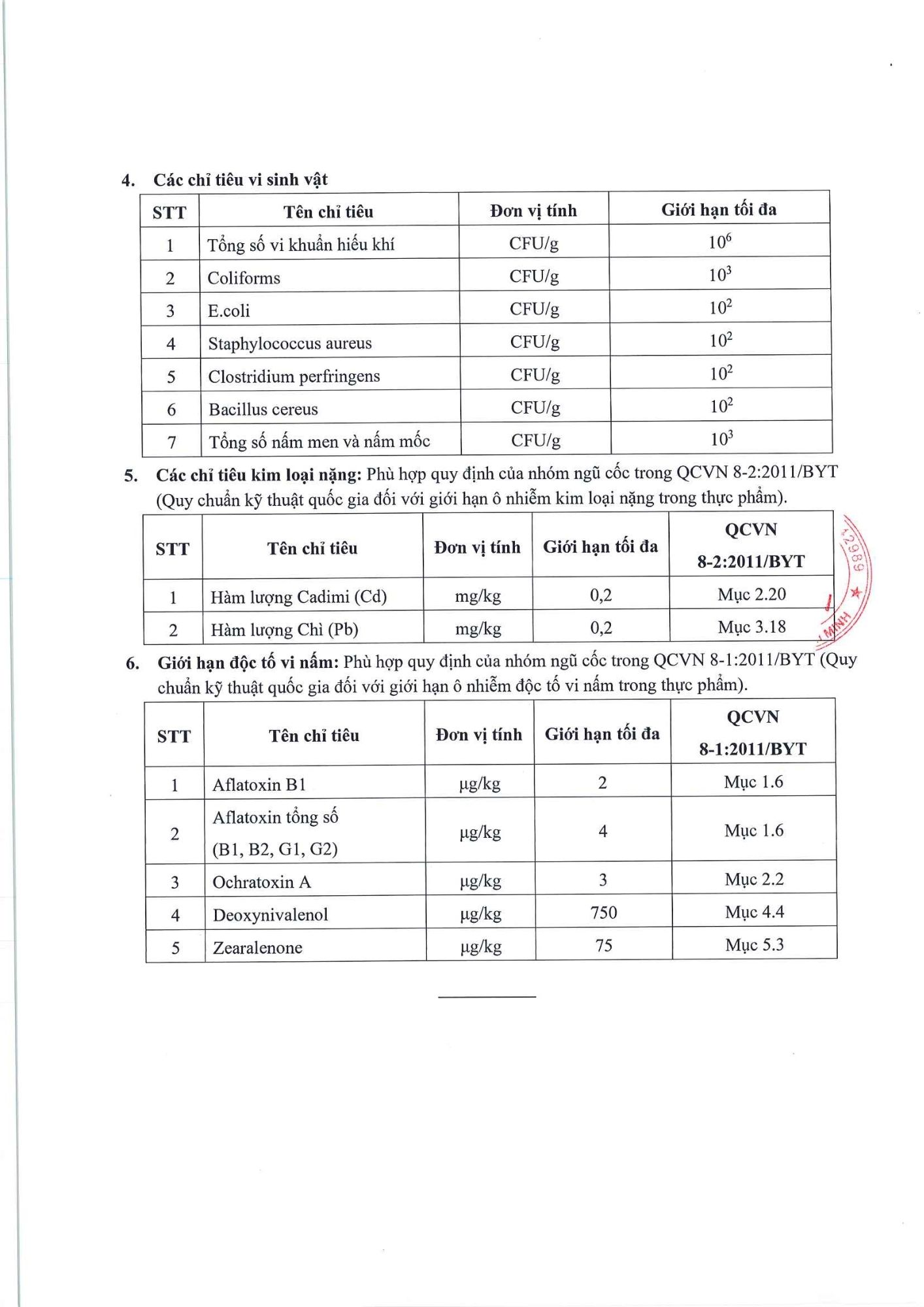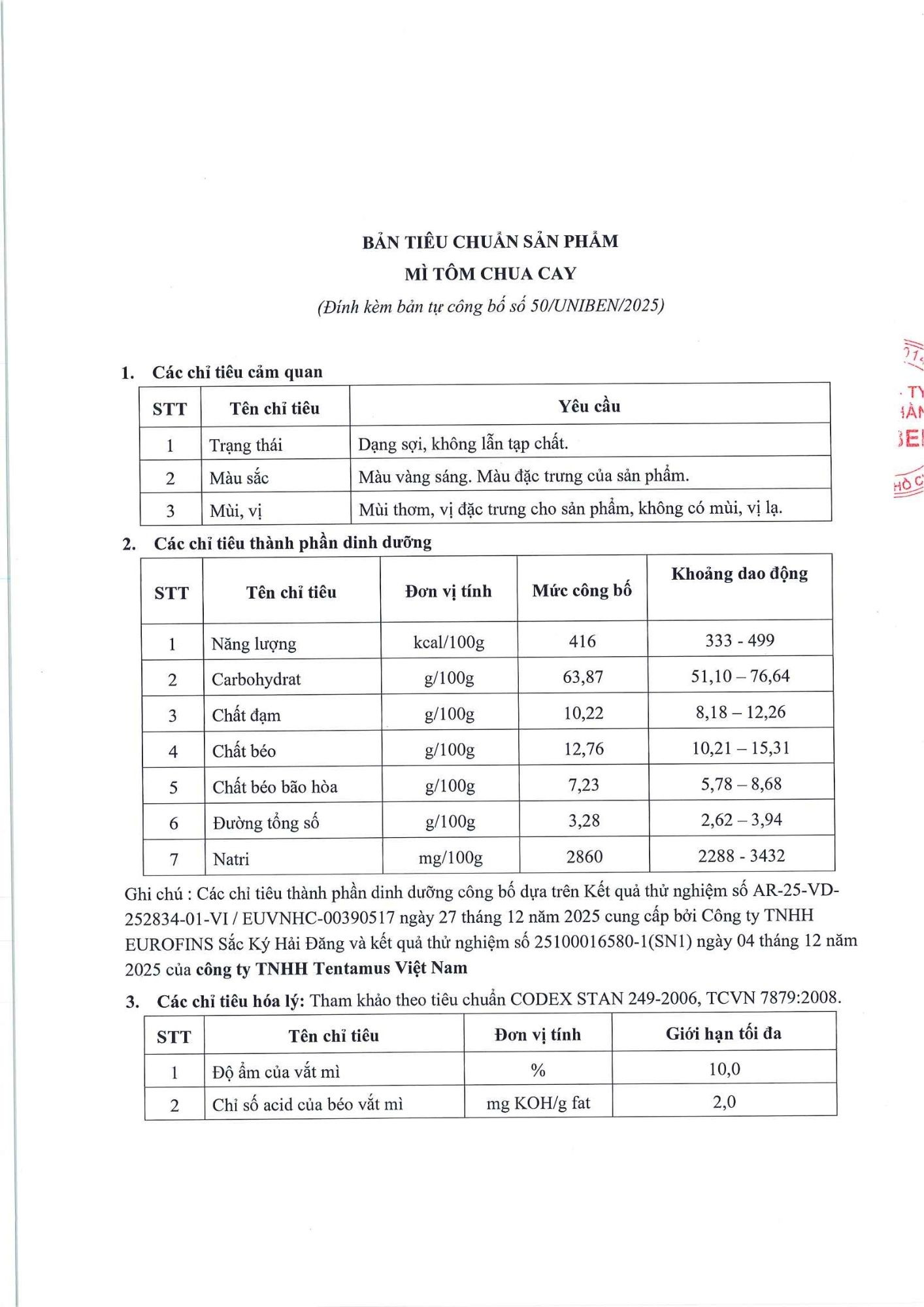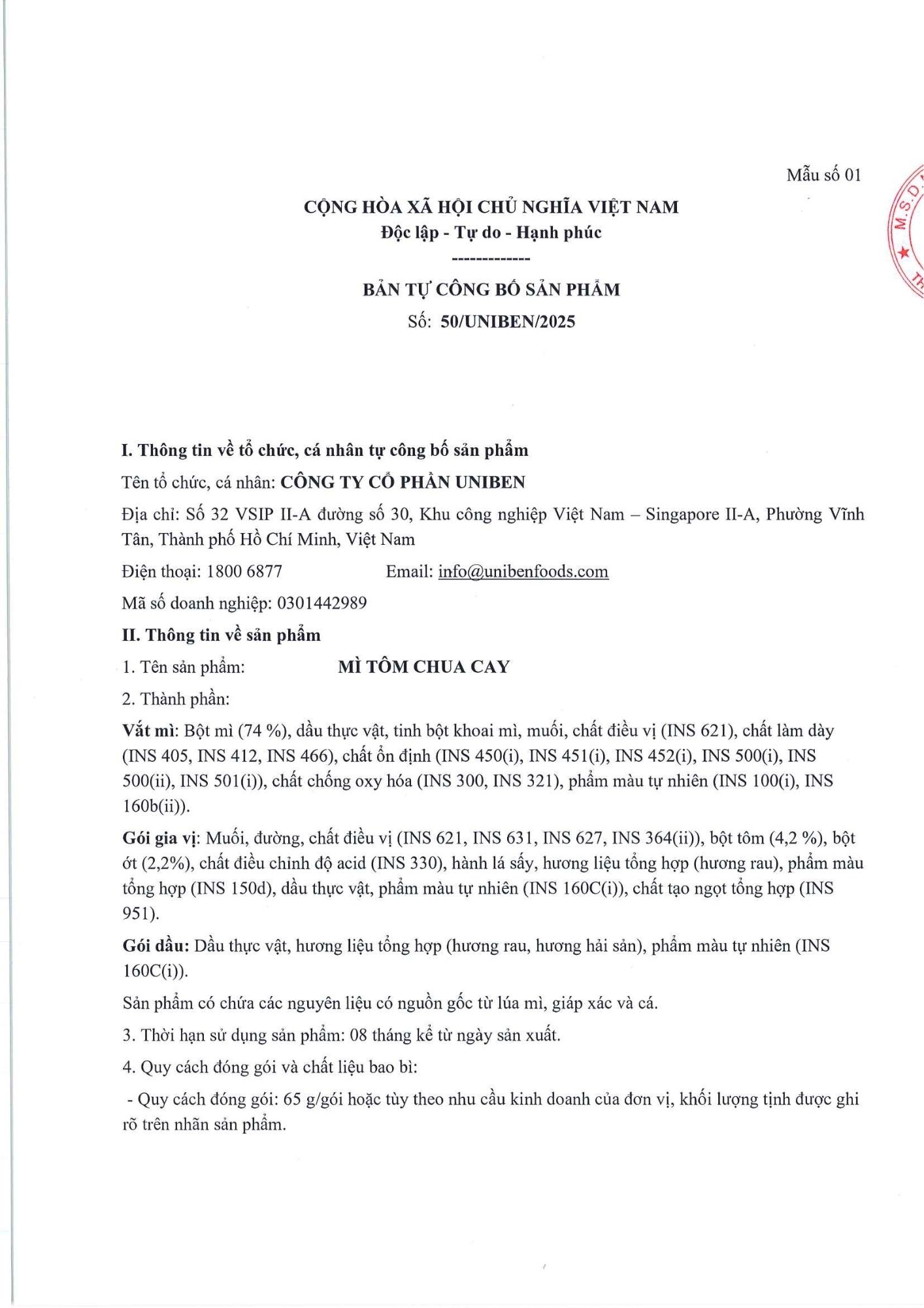 Bản tự công bố sản phẩm Mì Tôm Chua Cay