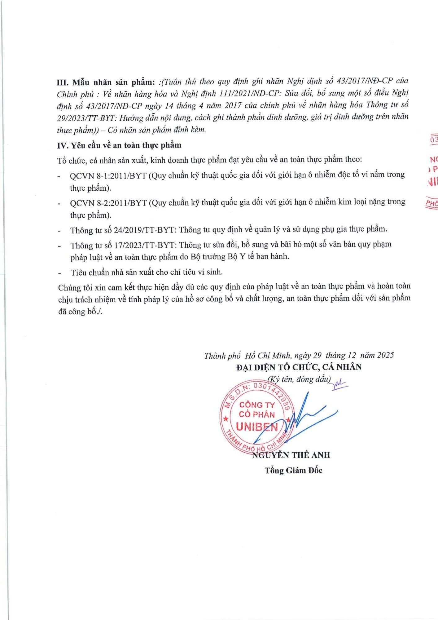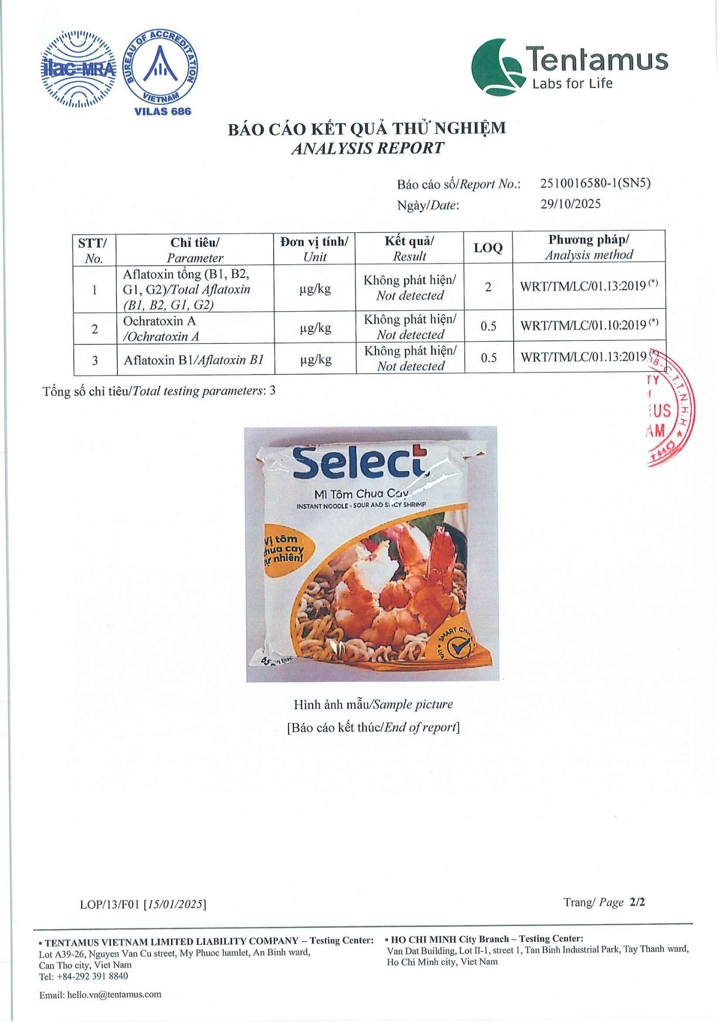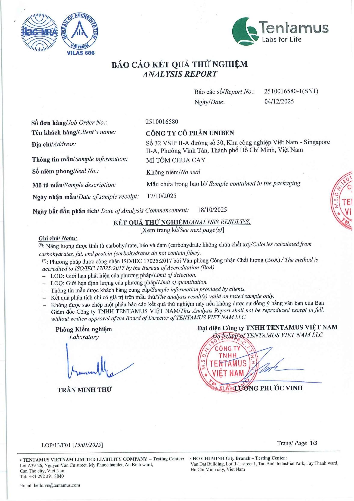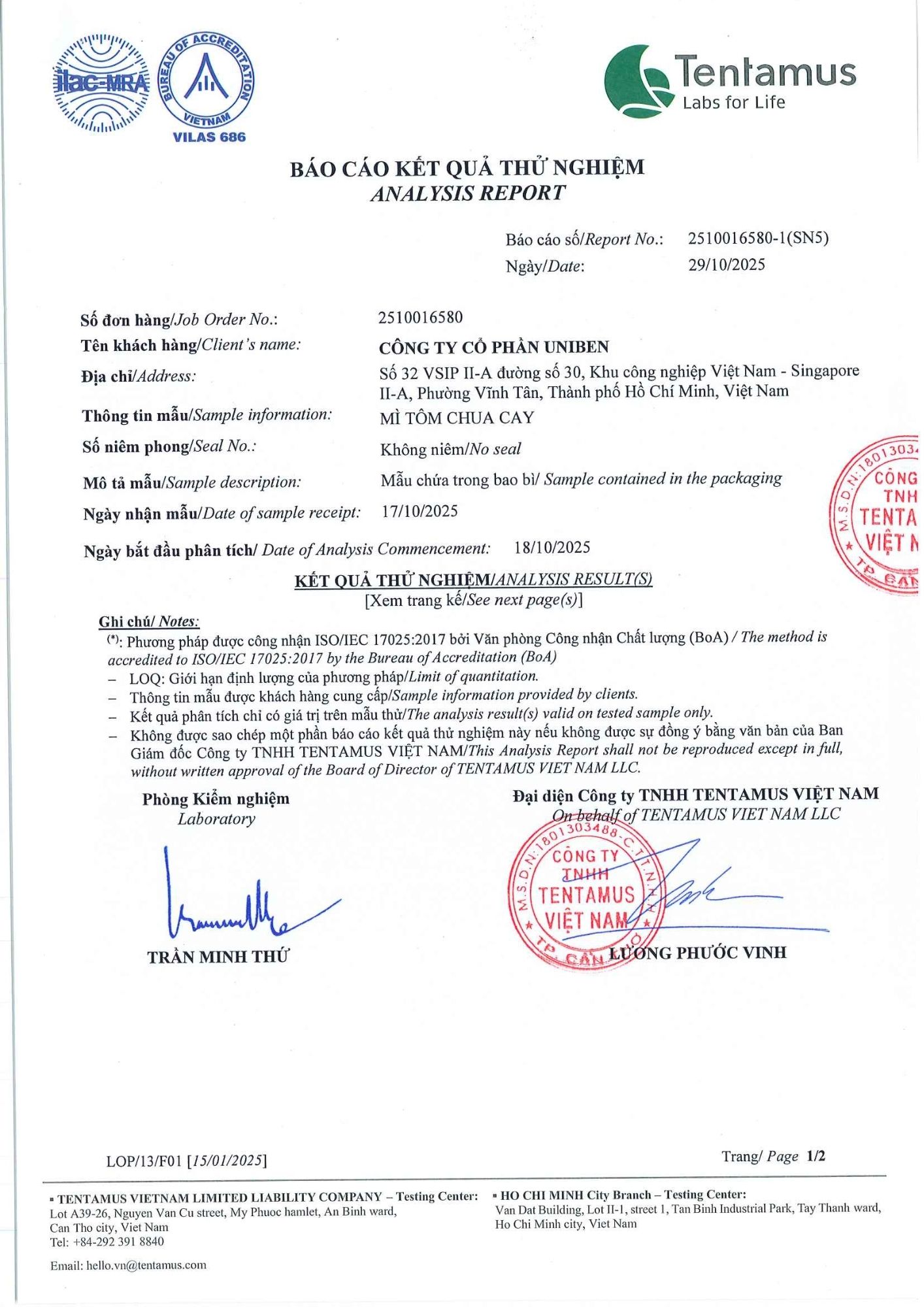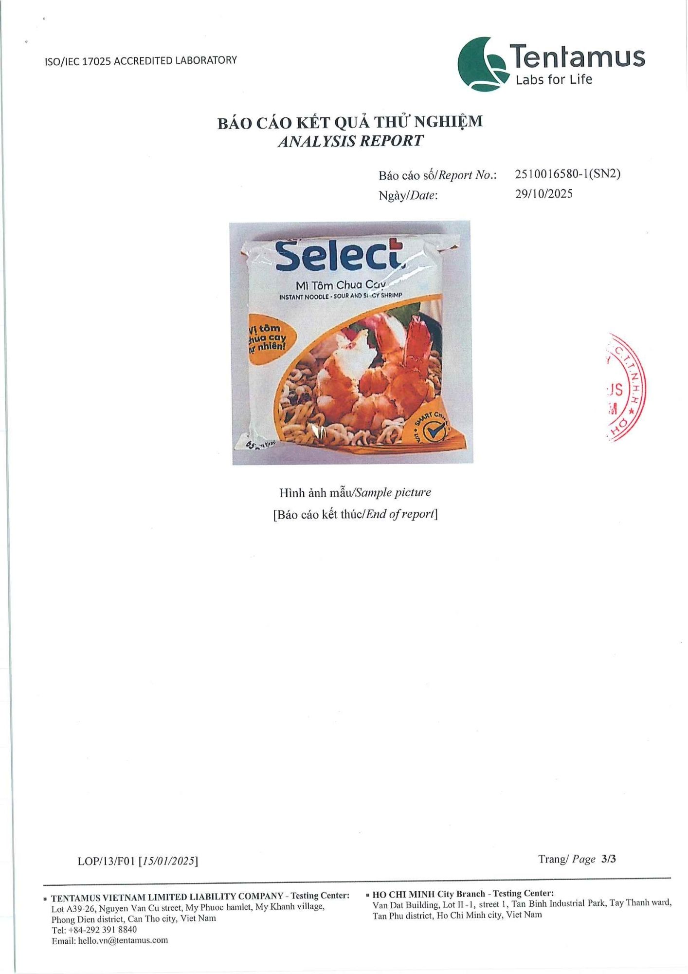 Bản tự công bố sản phẩm Mì Tôm Chua Cay