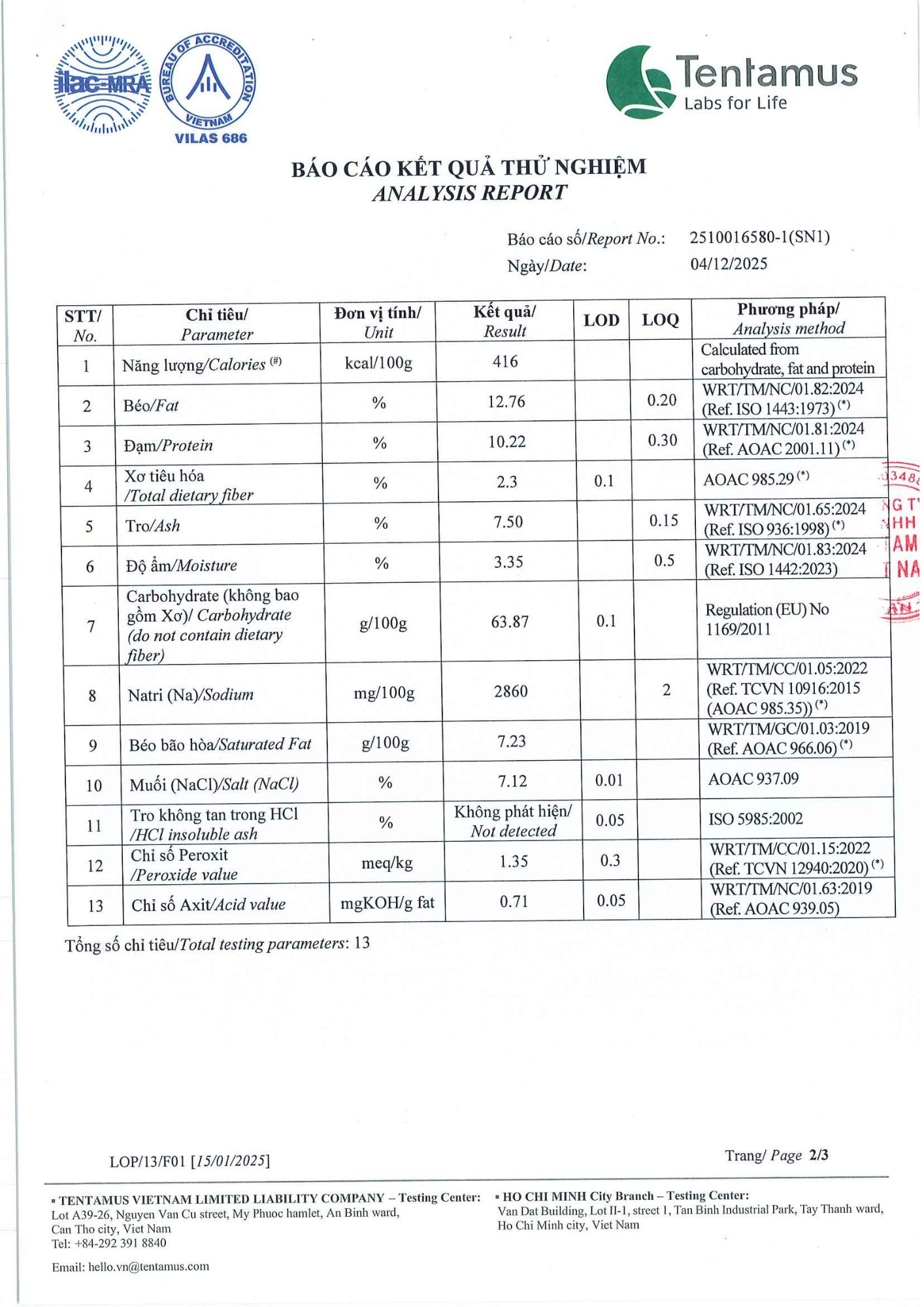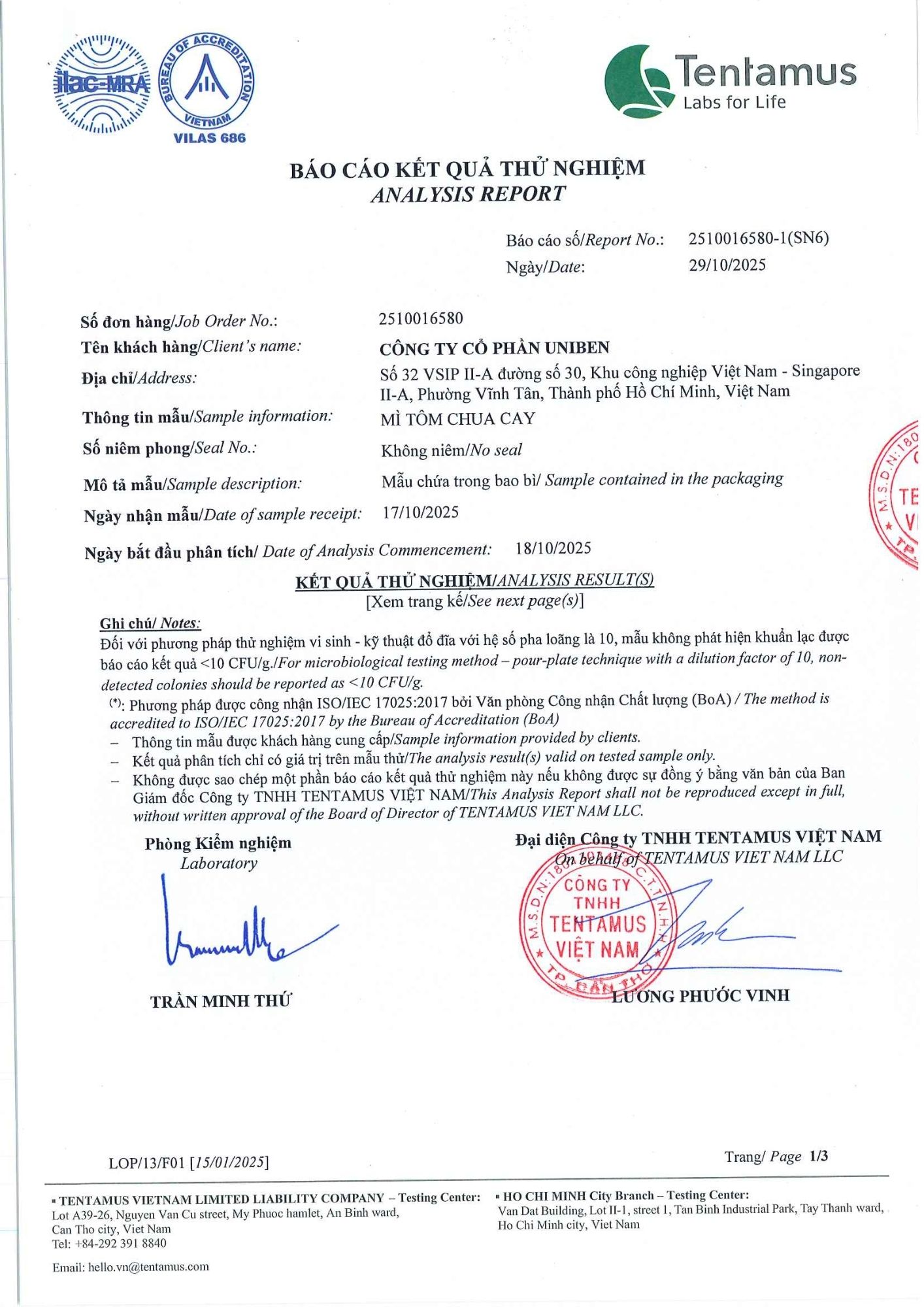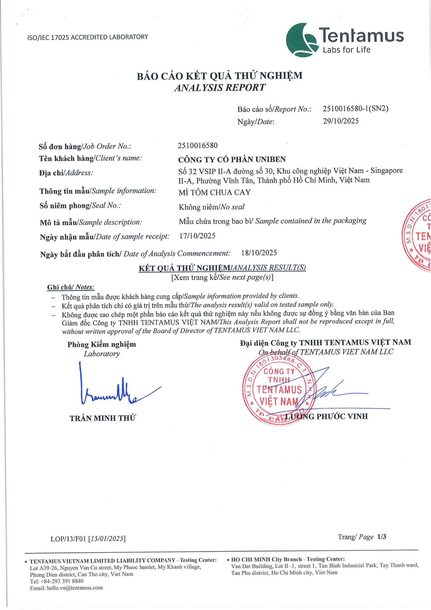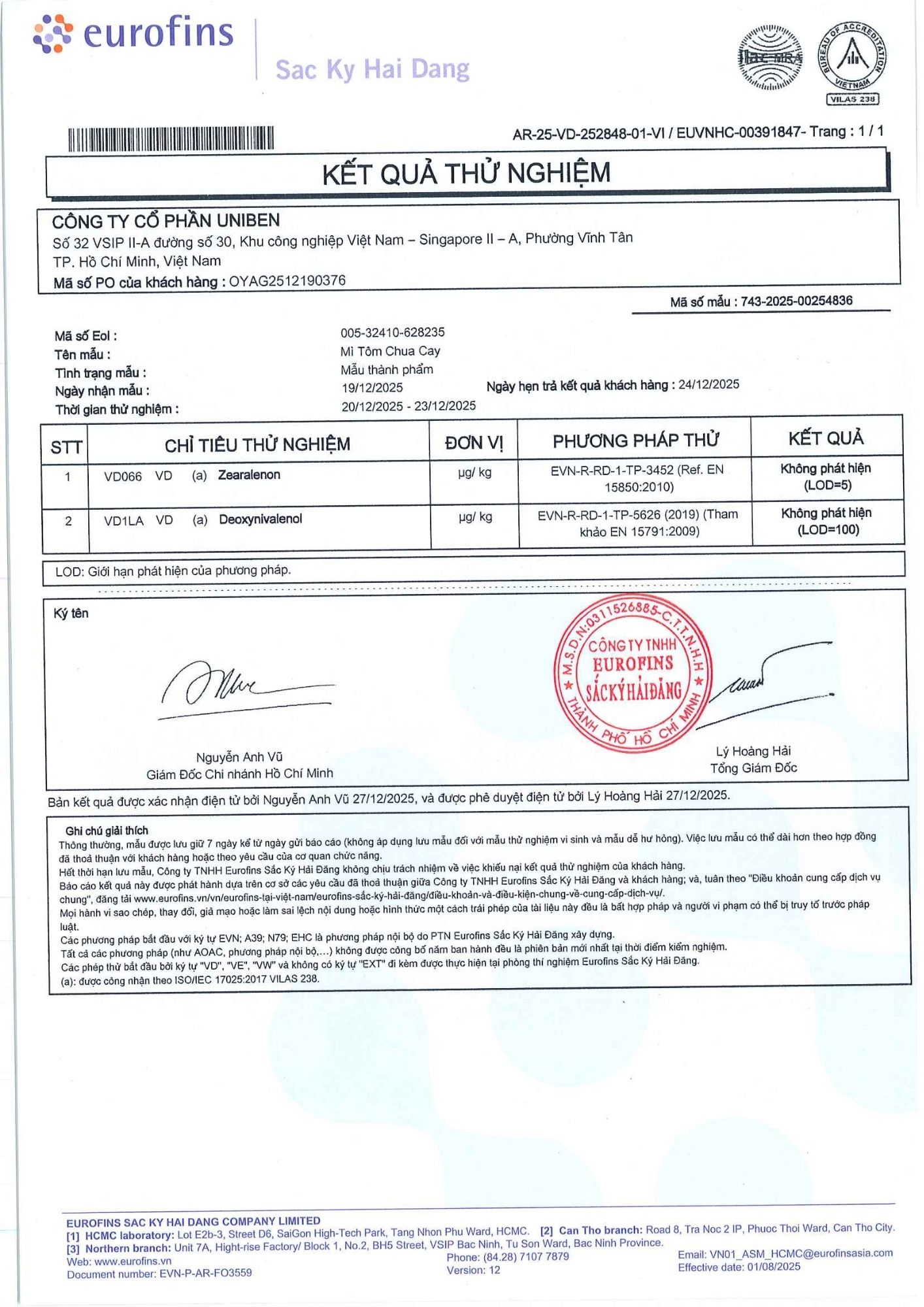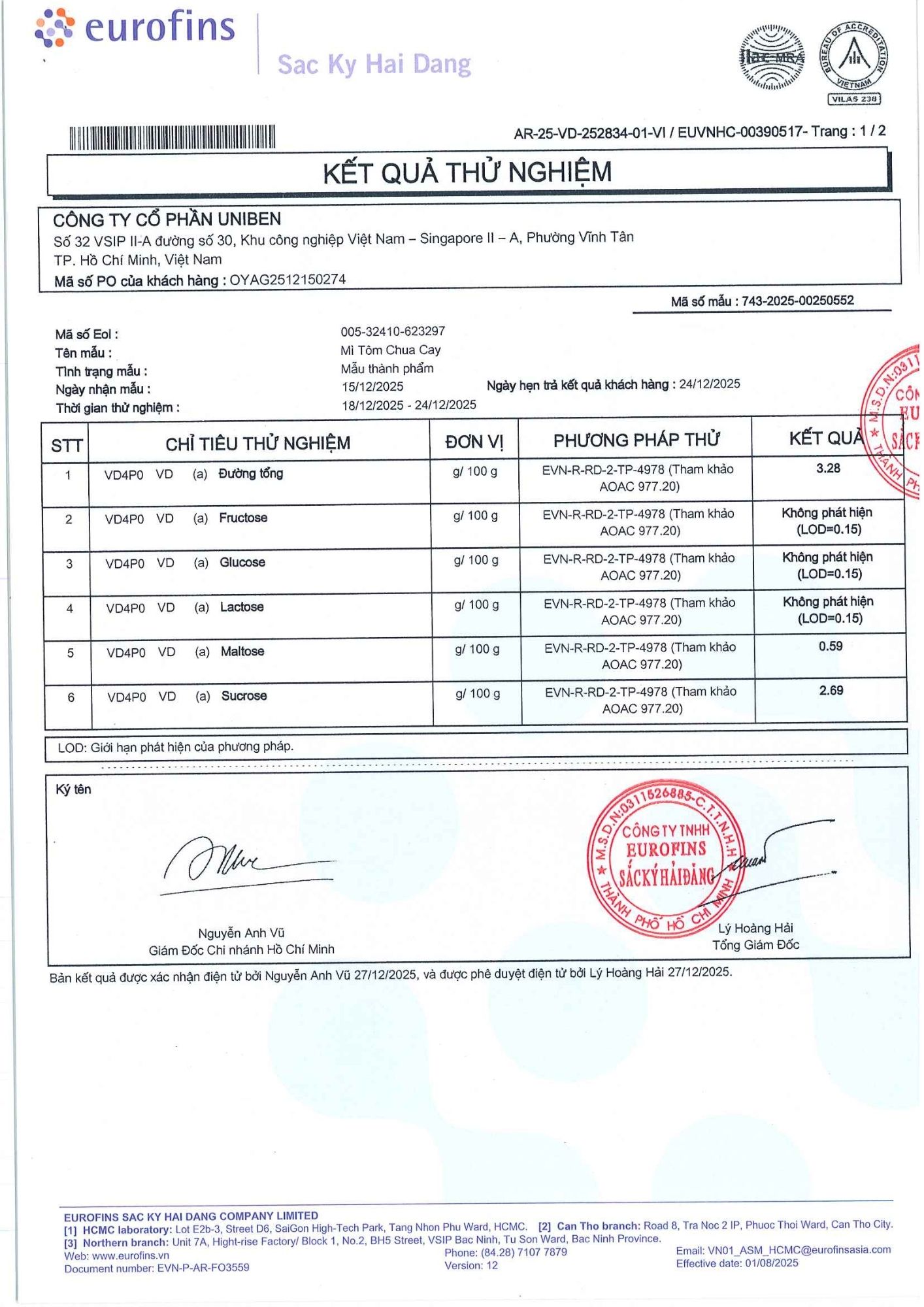 Bản tự công bố sản phẩm Mì Tôm Chua Cay