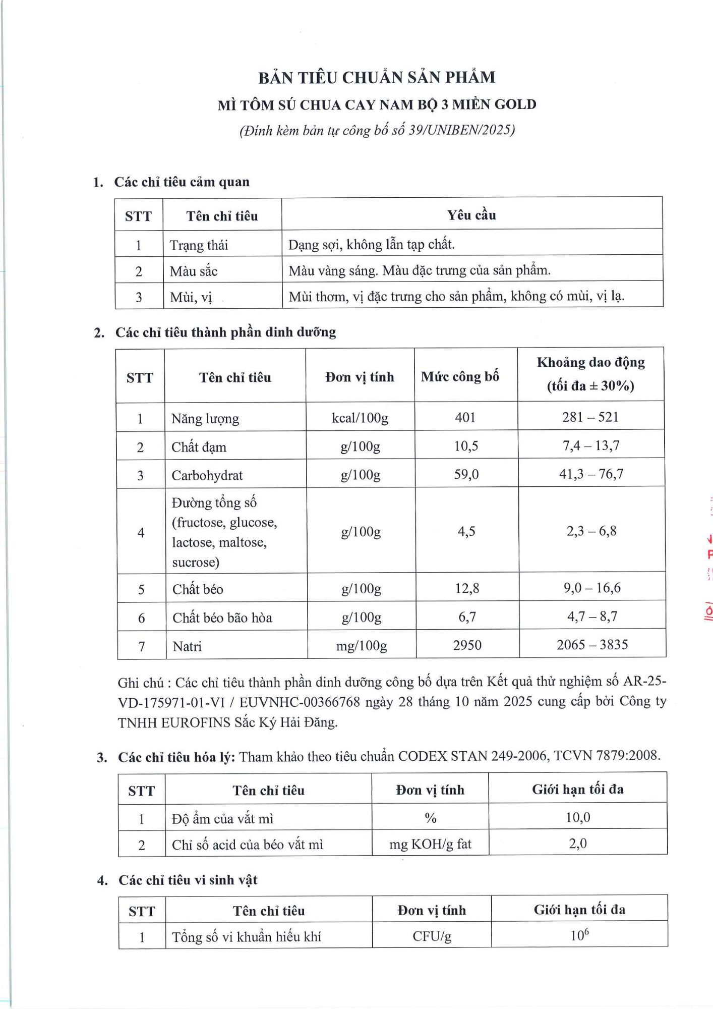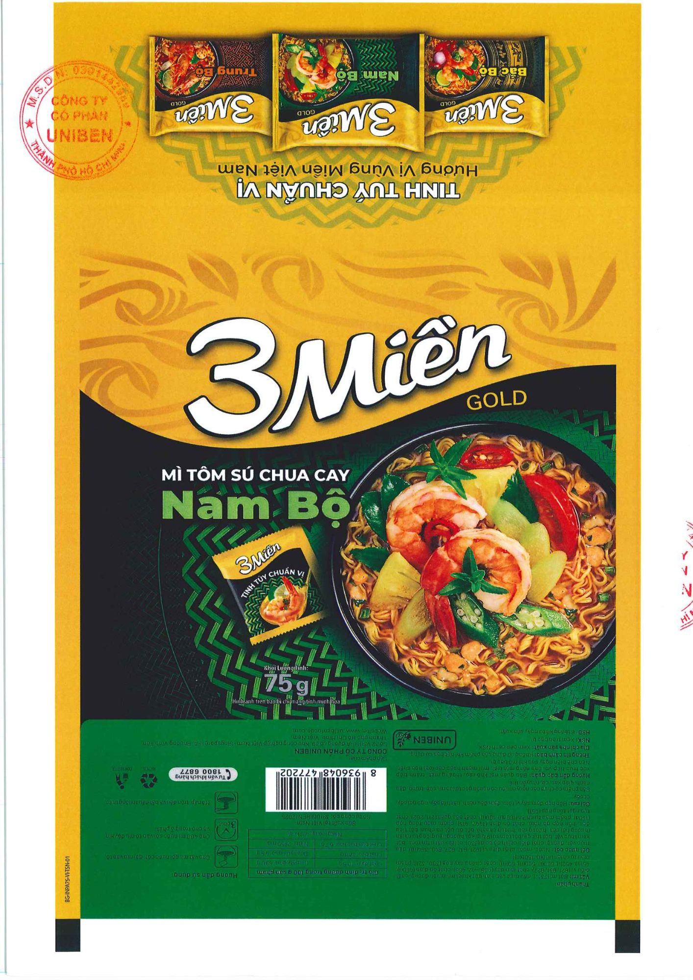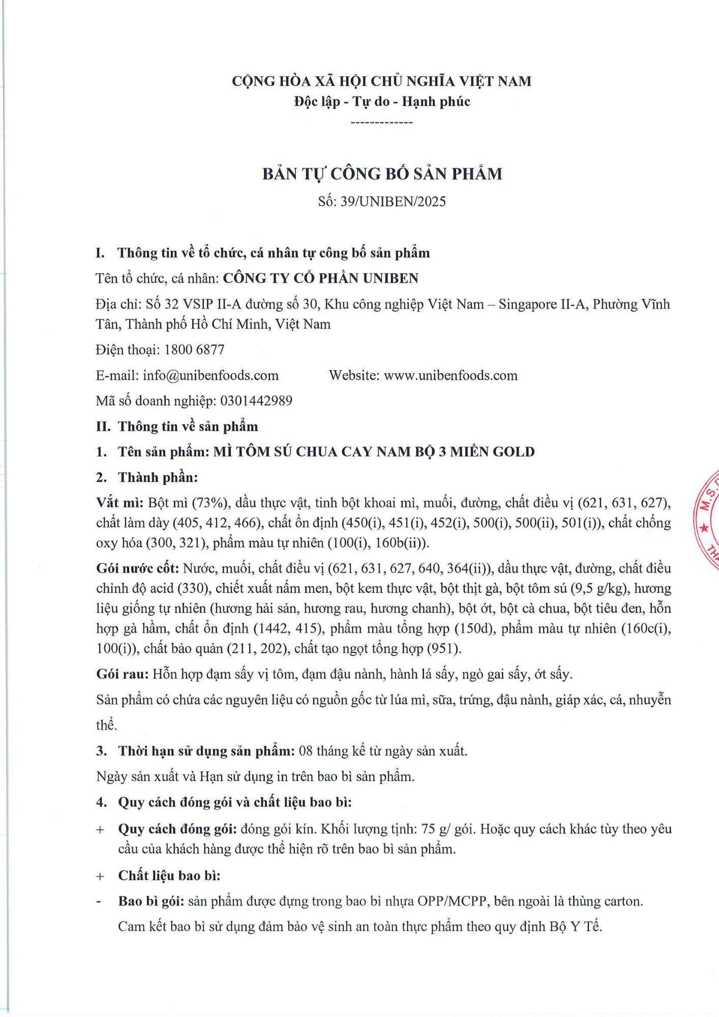 Bản tự công bố sản phẩm Mì Tôm Sú Chua Cay Nam Bộ 3 Miền Gold 25/11/2025