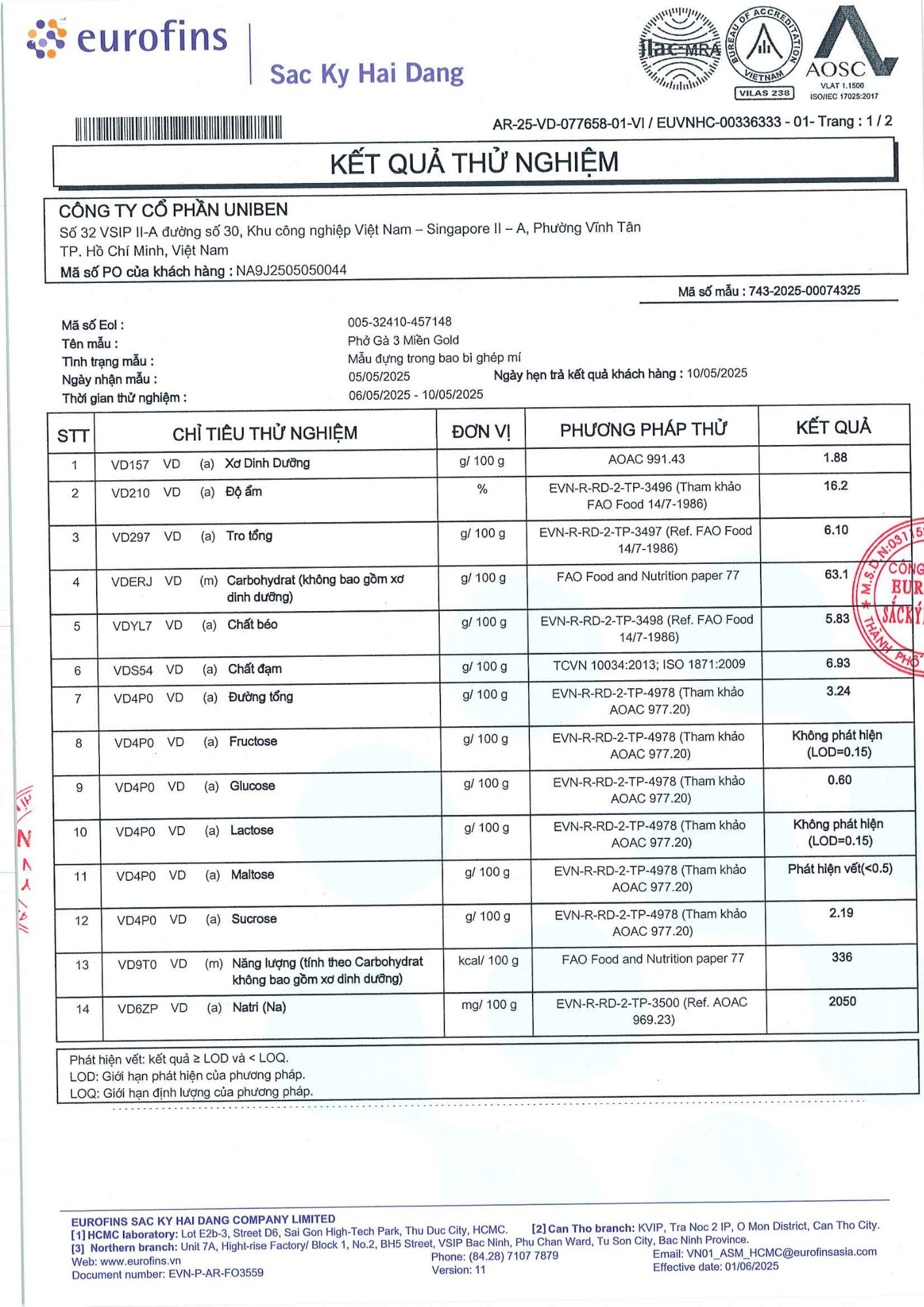 Bản tự công bố sản phẩm Mì Bò Hầm Rau Thơm 3 Miền GOLD