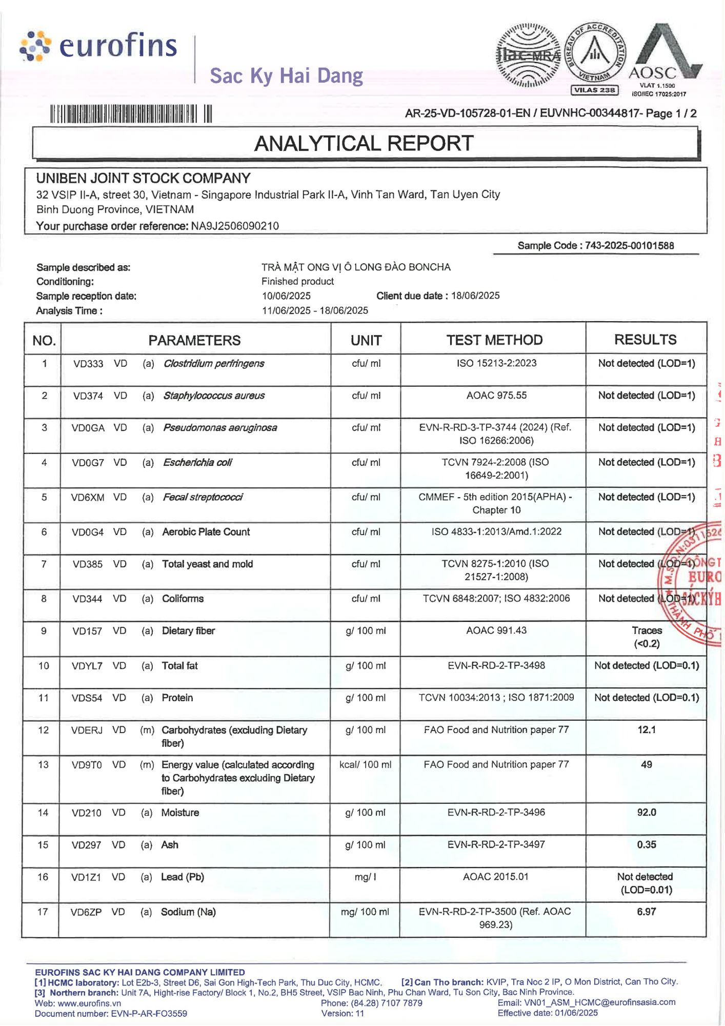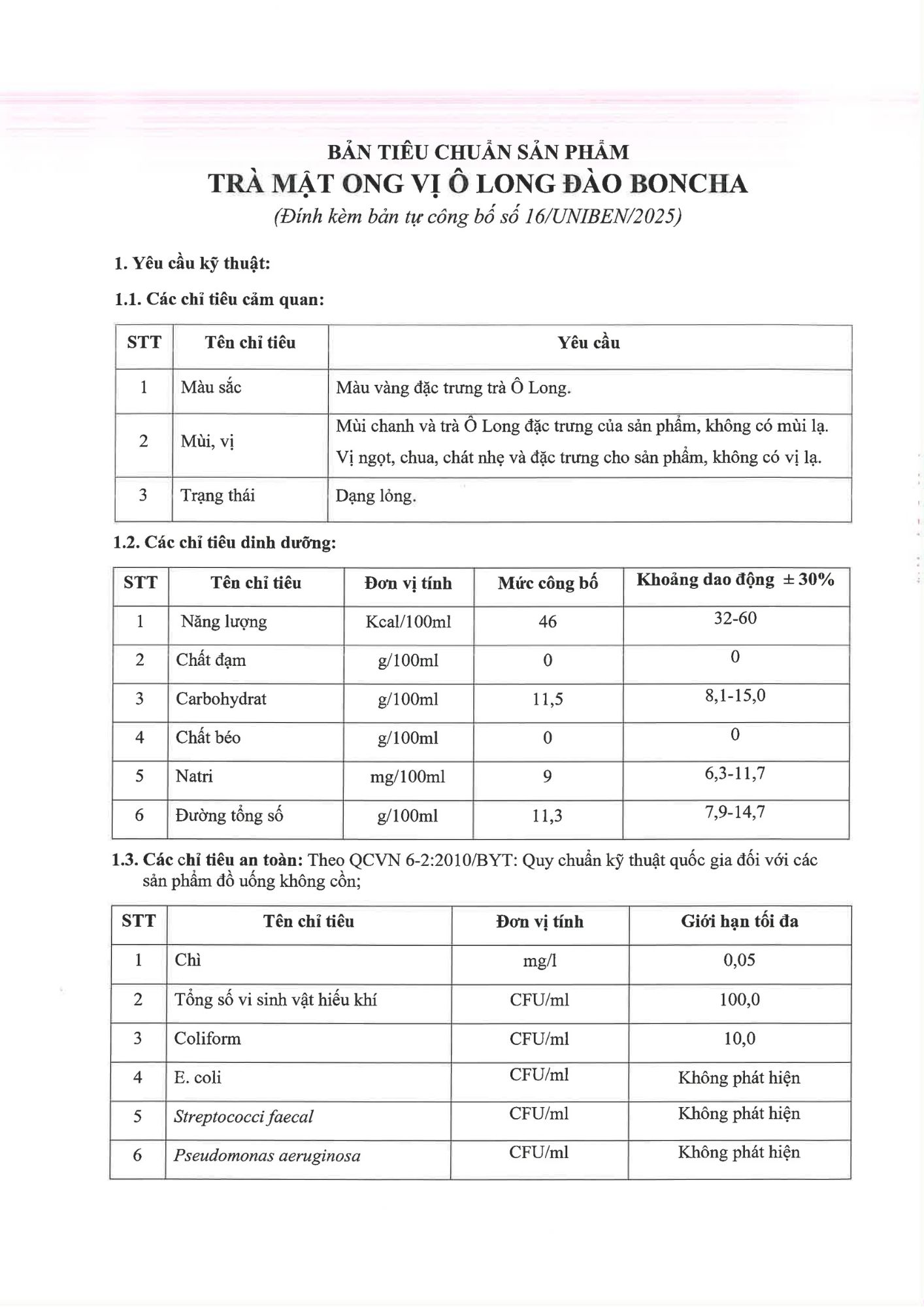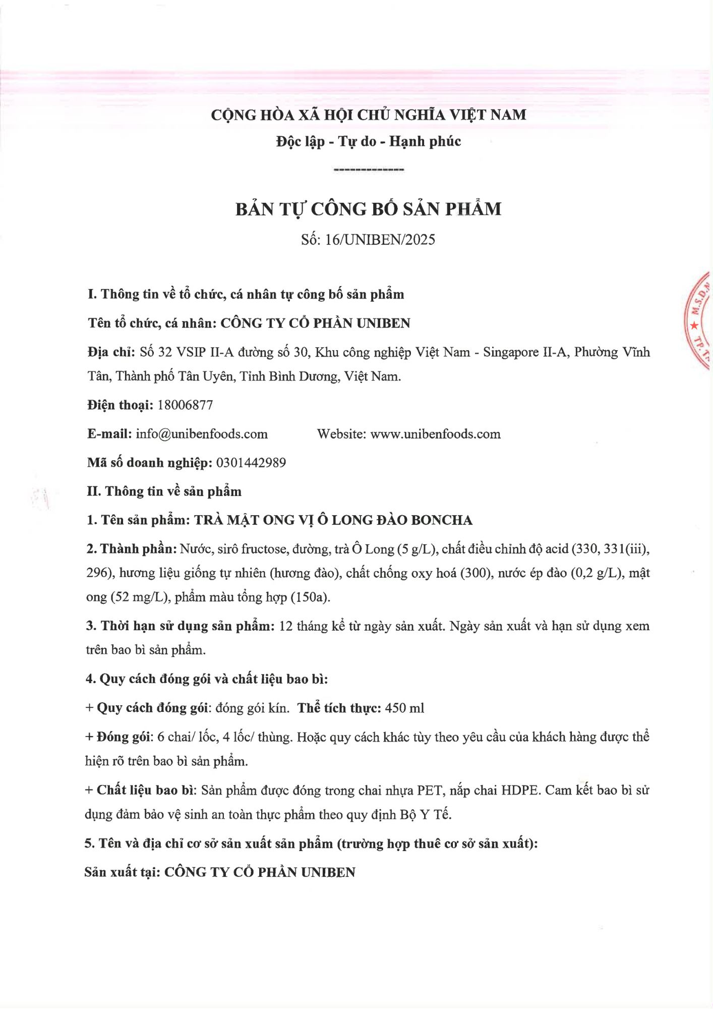 Bản tự công bố sản phẩm Trà mật ong BONCHA vị Ô Long Đào